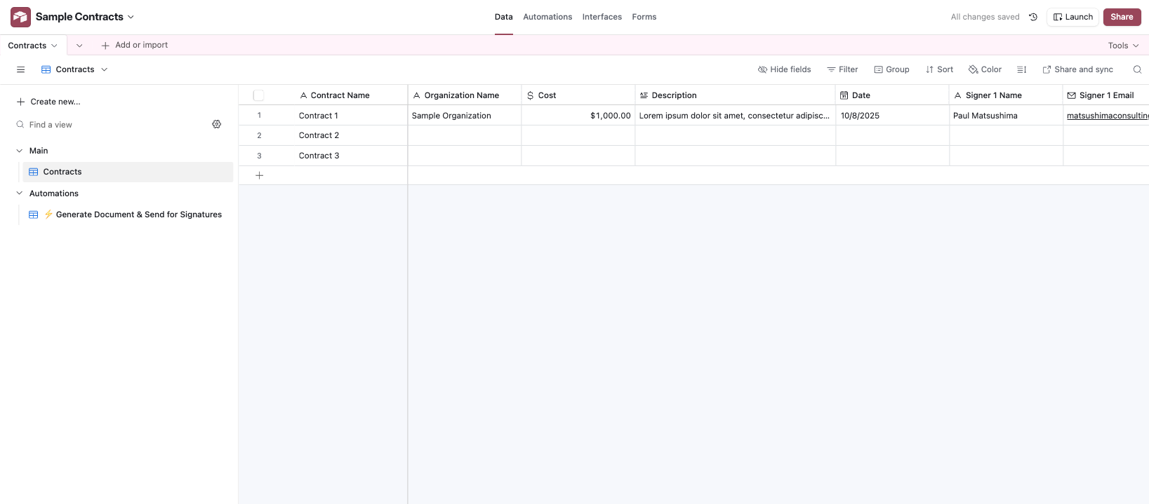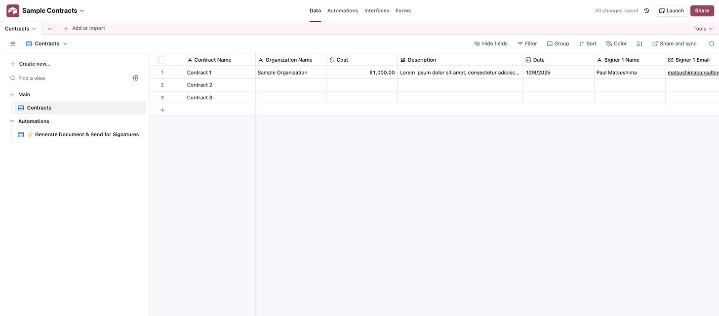 I started by creating a simple Airtable base structured for contracts.