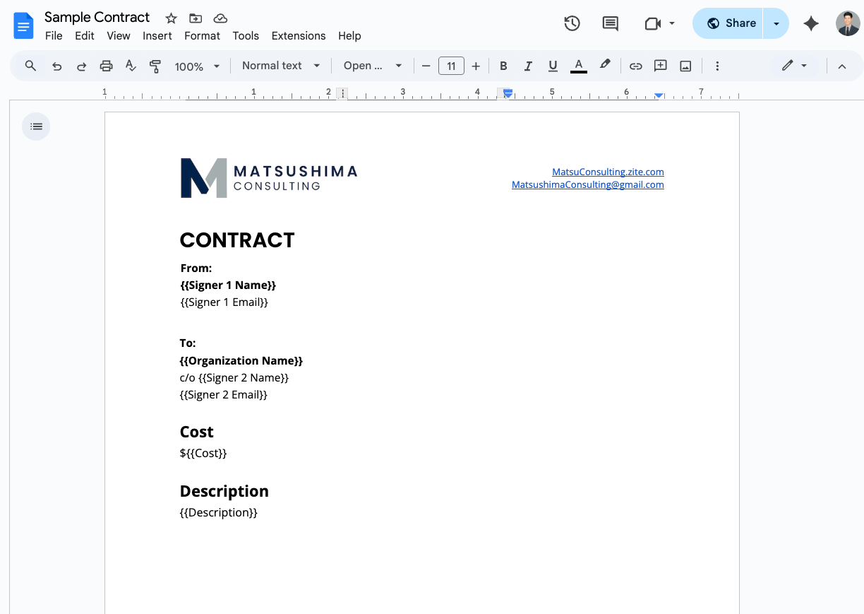 Next, I built a Google Docs template for the contract. This document includes placeholders (called “merge fields” or “merge tags”) (like {{Organization Name}}